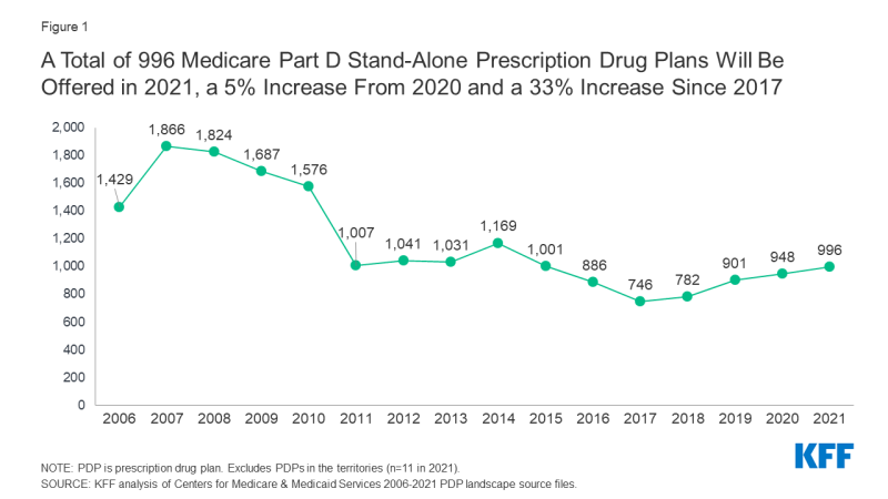 Figure 1: A Total of 996 Medicare Part D Stand-Alone Prescription Drug Plans Will Be Offered in 2021, a 5% Increase From 2020 and a 33% Increase Since 2017